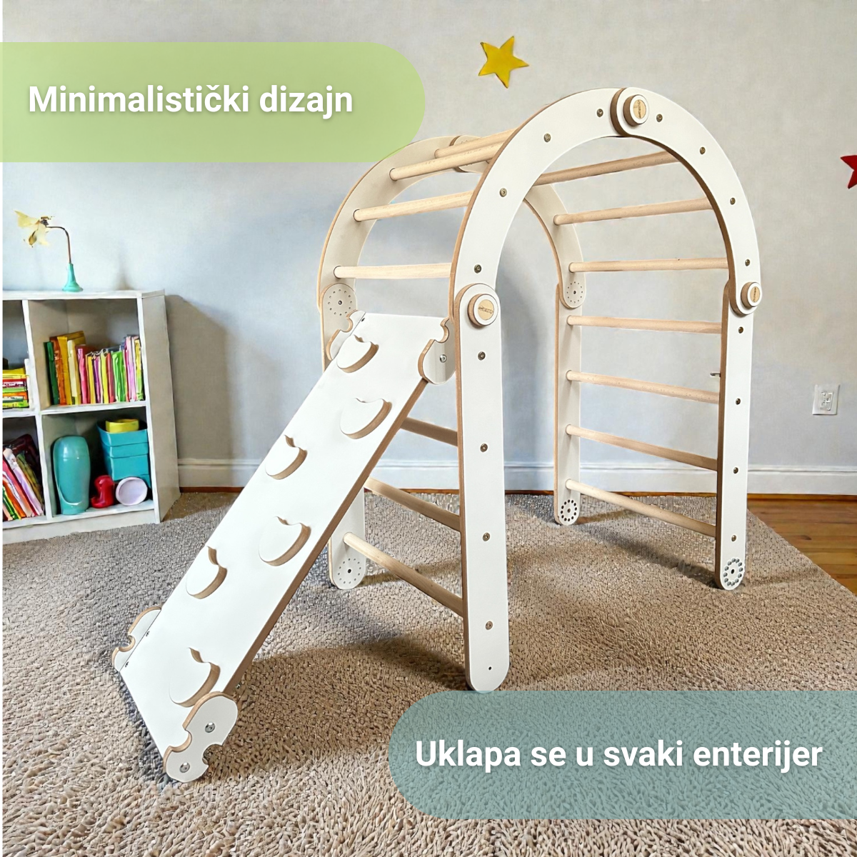 Ovaj drveni Montesori kompleks, inspirisan principima Emmi Pikler, podstiče prirodan razvoj deteta kroz slobodno kretanje, istraživanje i igru. Namenjen je mališanima od najranijeg uzrasta i pruža bezbedno okruženje za jačanje mišića, ravnoteže i koordinacije.